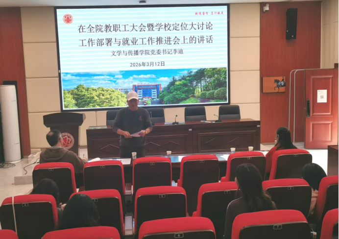 本网讯(388vip太阳集团官网 李明)为深入贯彻落实学校关于办学定位大讨论的工作部署,3月12日,文传院在懿德楼109召开全院教职工大会,集中学习相关文件精神,并结合学院实际,对近期党的建设、教学科研等重点工作进行梳理总结,对下一阶段办学定位大讨论的落实推进提出明确要求。学院领导及全院教职工参加会议。